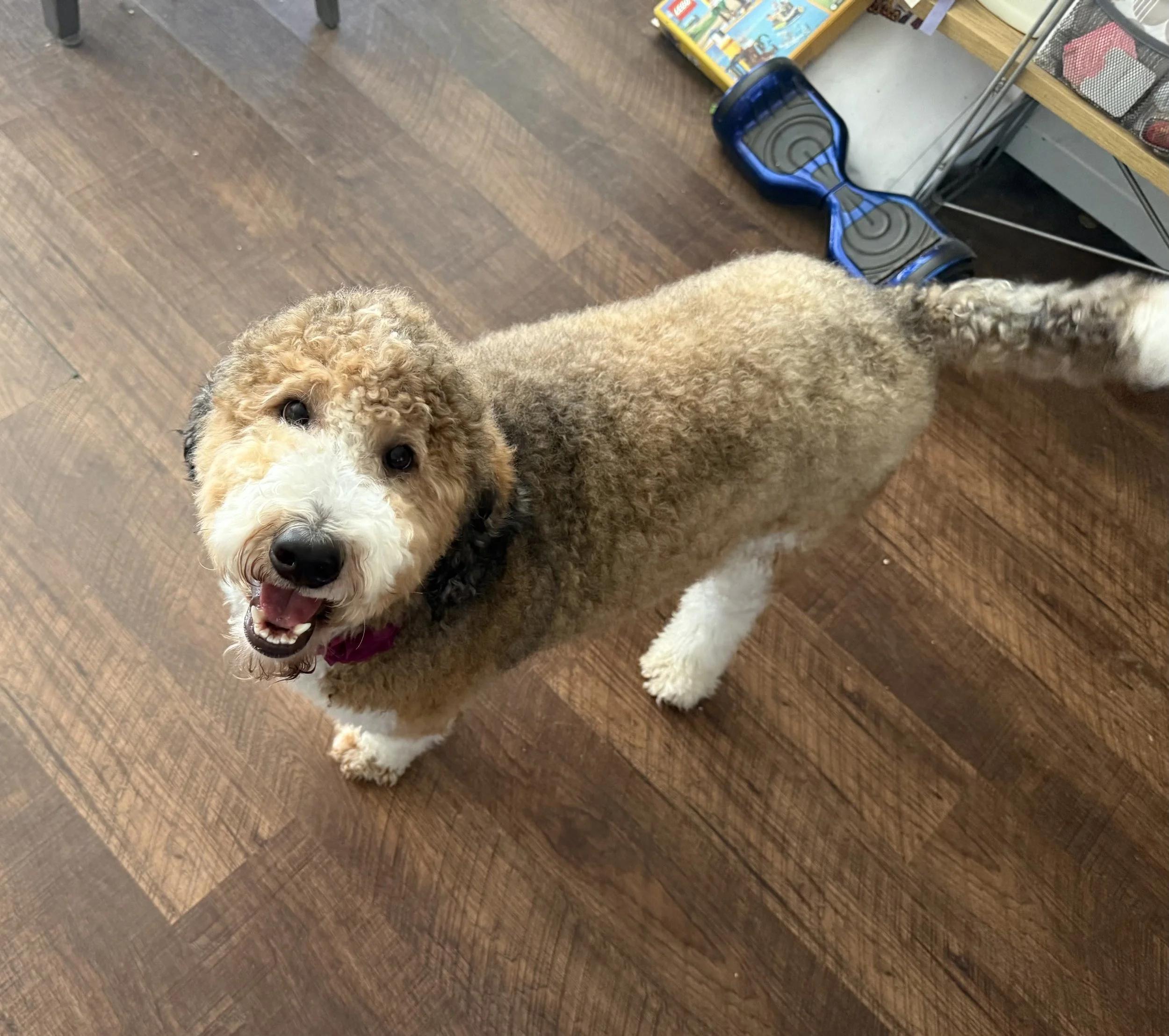 ZUES is so cute and sweet. He looks like an adorable Teddy Bear! He is calm, loving and adores snuggles. Zues is an Australian Bernedoodle. He is kind and gentle just like his parents and grandparents. Zues was easy to train he has amazing eye contact and is very eager to please. We anticipate he will be passing his wonderful qualities down to his offspring.