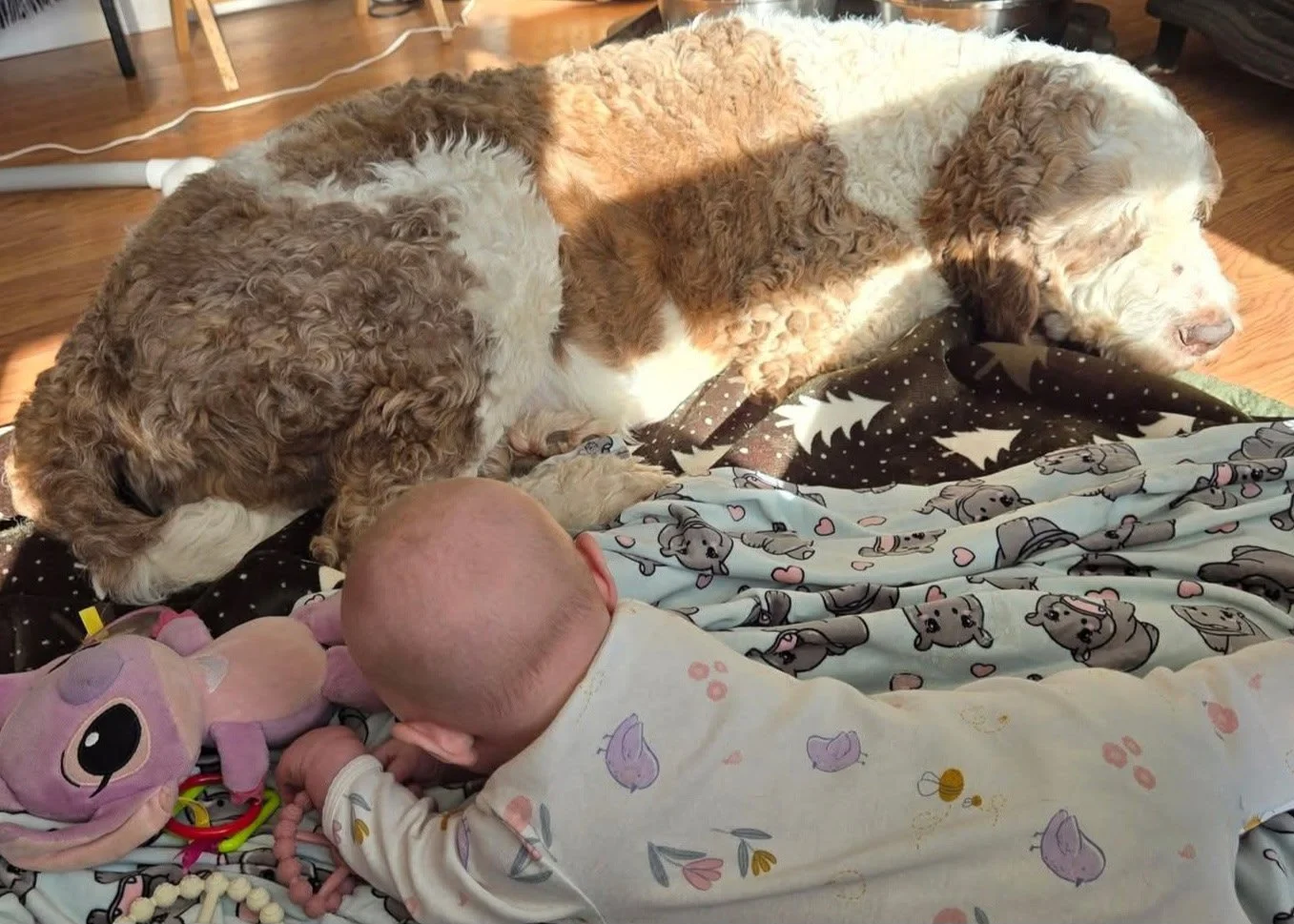 RIVER (Saint Berdoodle) River is the sweetest, and most kind girl ever. She knows no stranger and loves giving doggie snuggles and kisses. Her recall is excellent. River loves everyone she meets four legged or two. She adores children. River loves on all of her guardian families 3 kids. Her puppies will be raised in her guardian home around children and other pets.