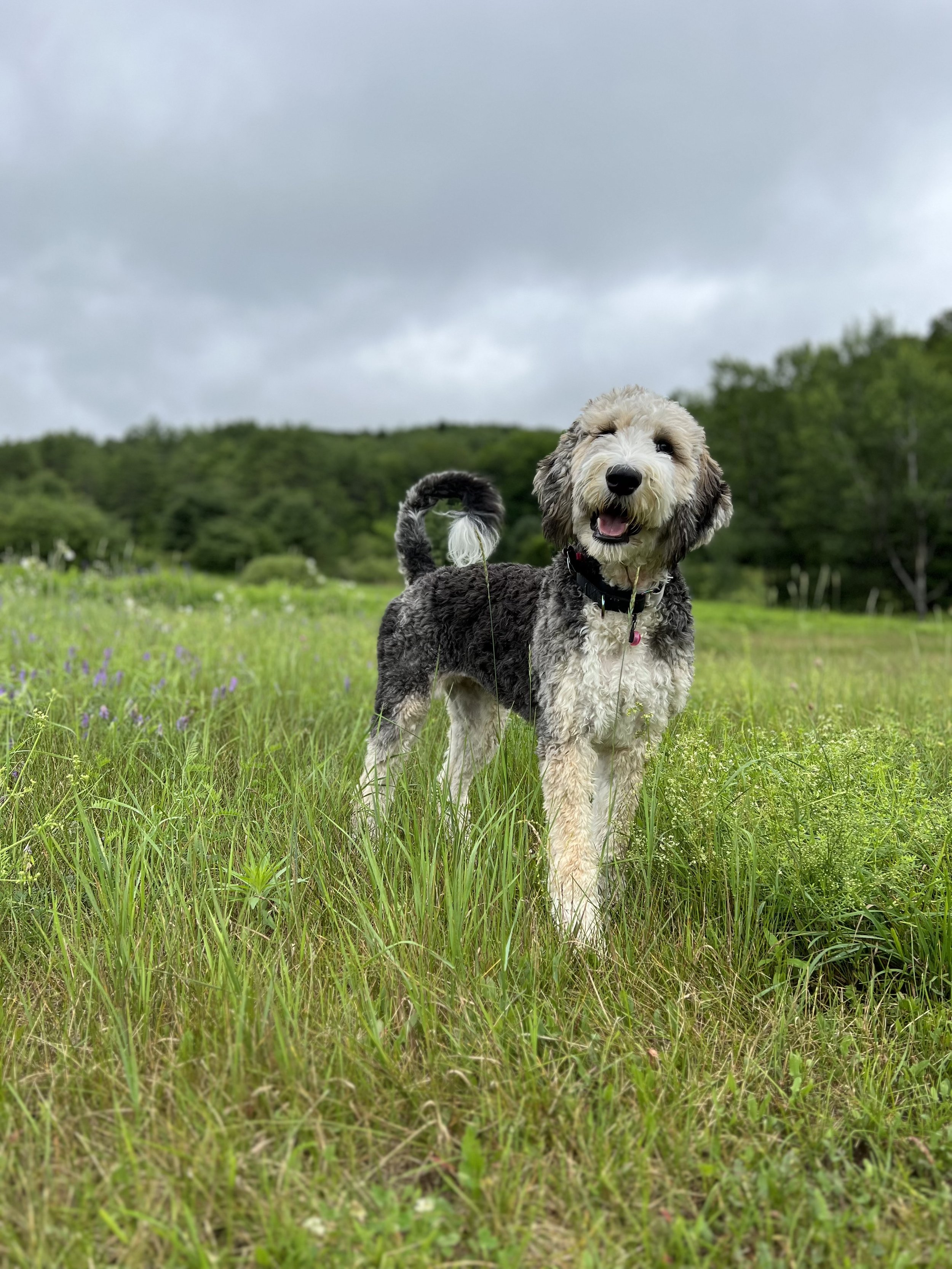 DANTE (Pictured above) is a beautiful Bernedoodle. He is the love of his guardian homes life. Dante goes everywhere with them. He lives in NH with his guardian home family and can be seen around Keene on the trails headed to town for a pastry and coffee. Dante is a love bug and is super friendly to any and all that he meets. He adores children and other dogs and is up for a good game of fetch if anyone wants to play. He is a faithful companion with no need for a leash. Dante has excellent eye contact a great eagerness to please and was very easy to train. We anticipate him passing that on to his puppies.