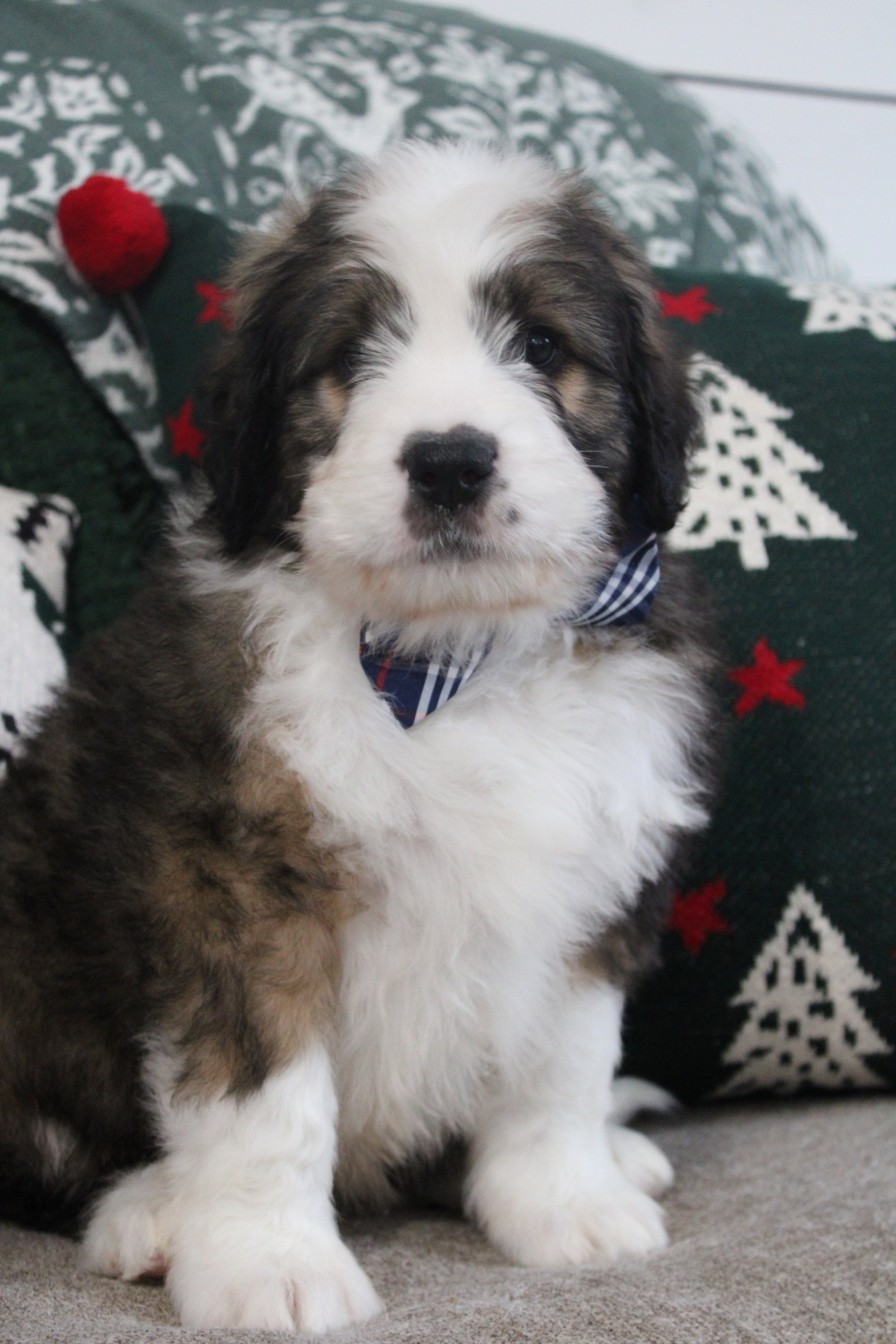 AVAILABLE Maggie’s Australian Saint Bernedoodles BOSTON (M) estimated size at maturity 55-65lbs go home date 1/17/26. Free delivery if within 4 hours of Keene NH