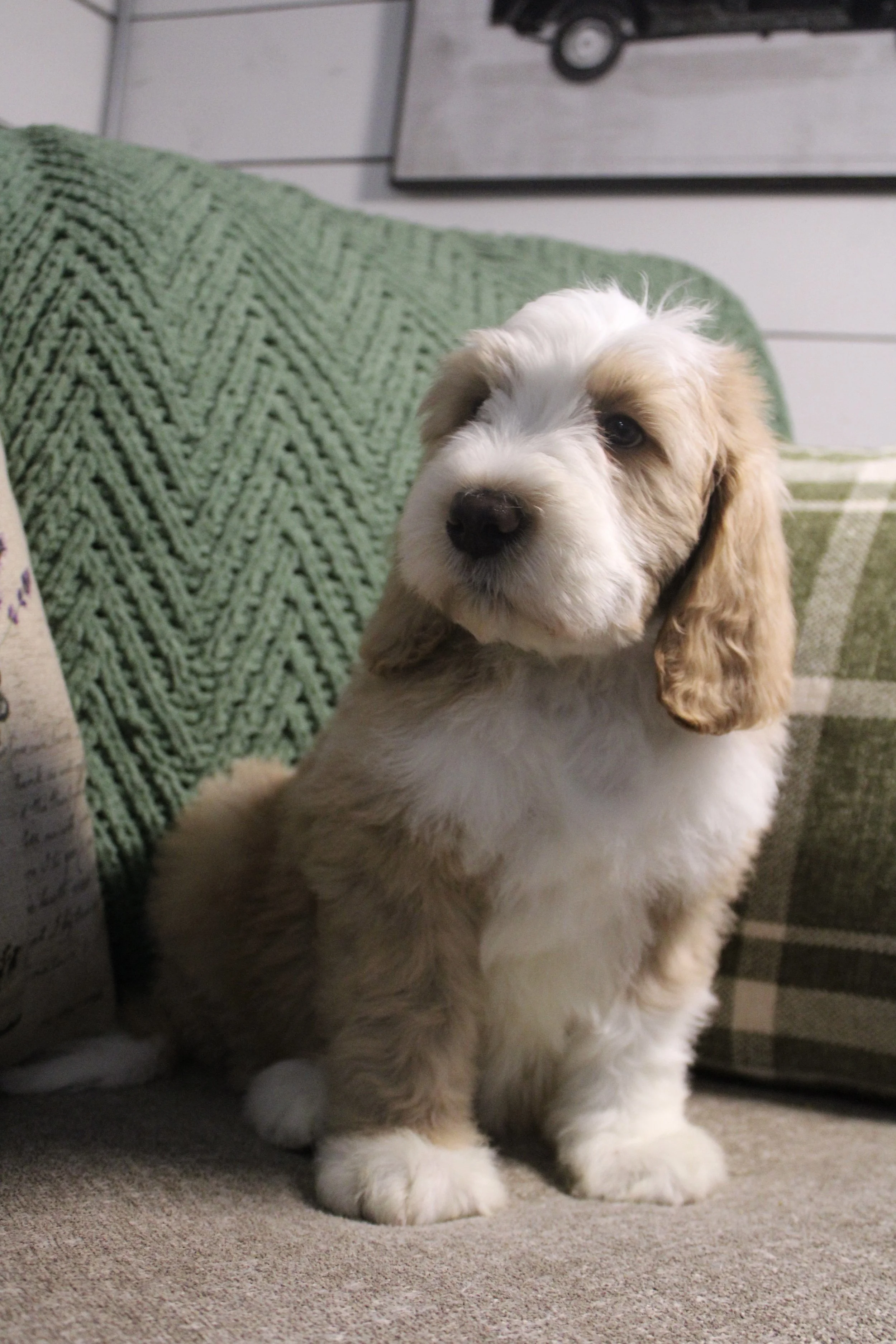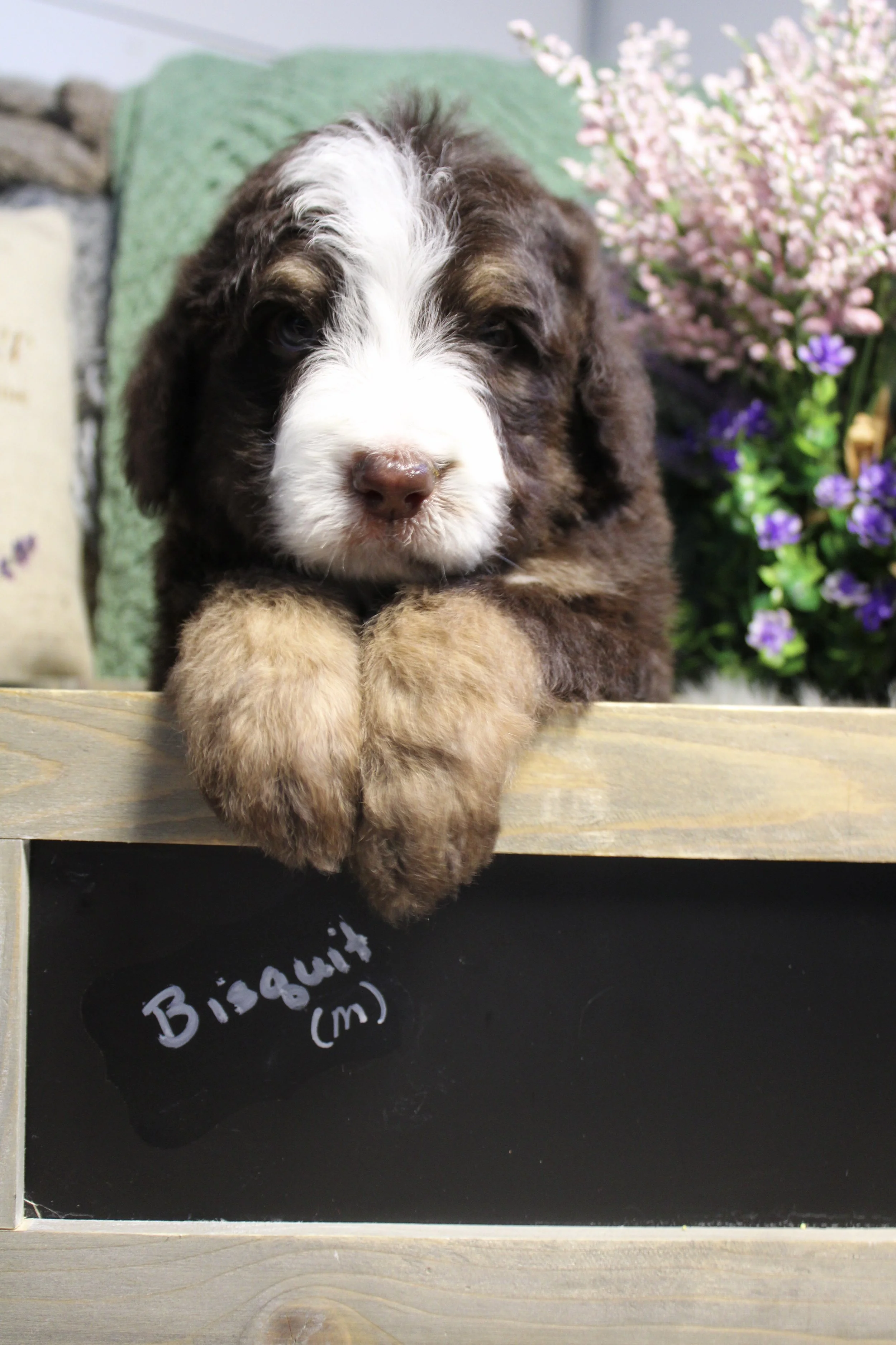 AVAILABLE Olive’s Australian Saint Bernedoodle BISQUIT (M) estimated size at maturity 55-65lbs go home date 2/8/26. Free delivery if within 4 hours of Keene NH