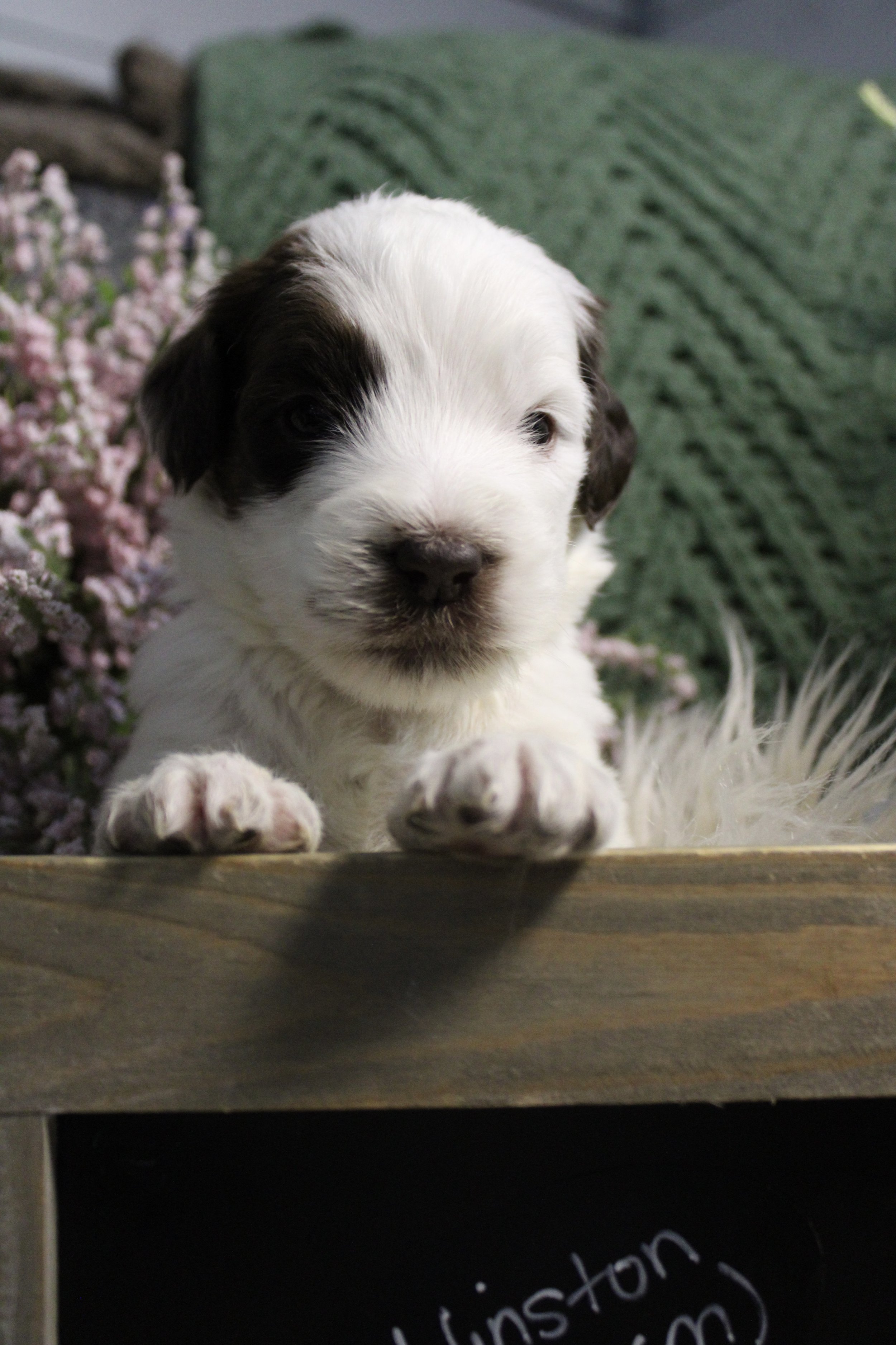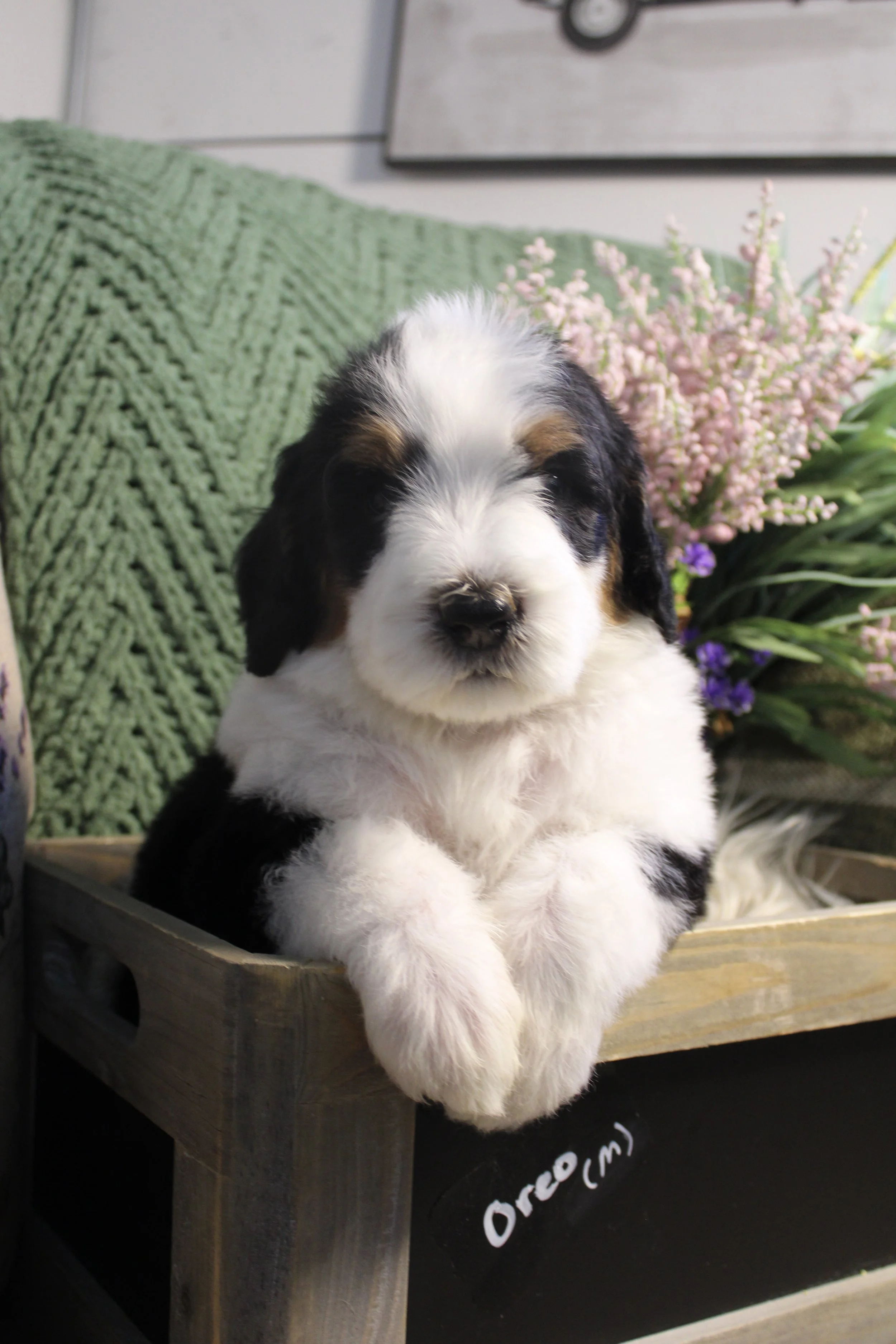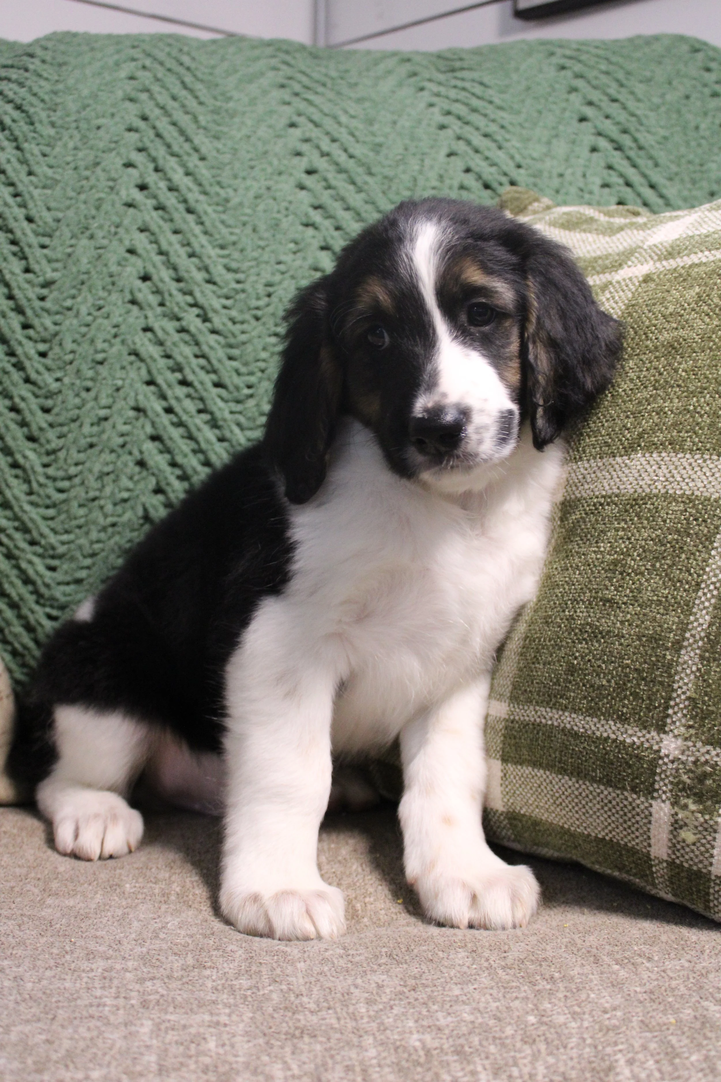 AVAILABLE Olive’s Australian Saint Bernedoodle OREO (M) estimated size at maturity 55-65lbs go home date 2/8/26. Free delivery if within 4 hours of Keene NH