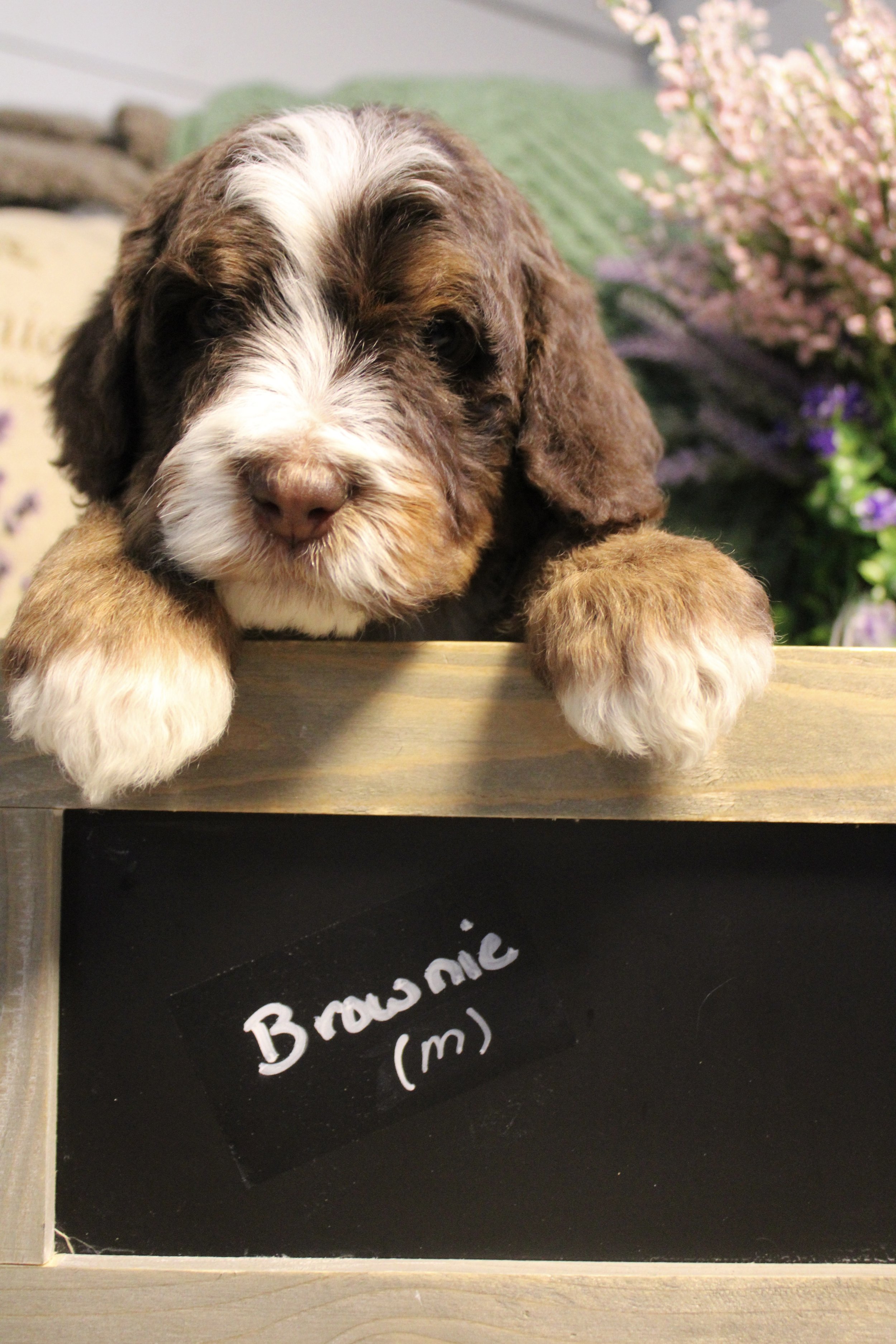 AVAILABLE Olive’s Australian Saint Bernedoodle BROWNIE (M) estimated size at maturity 55-65lbs go home date 2/8/26. Free delivery if within 4 hours of Keene NH