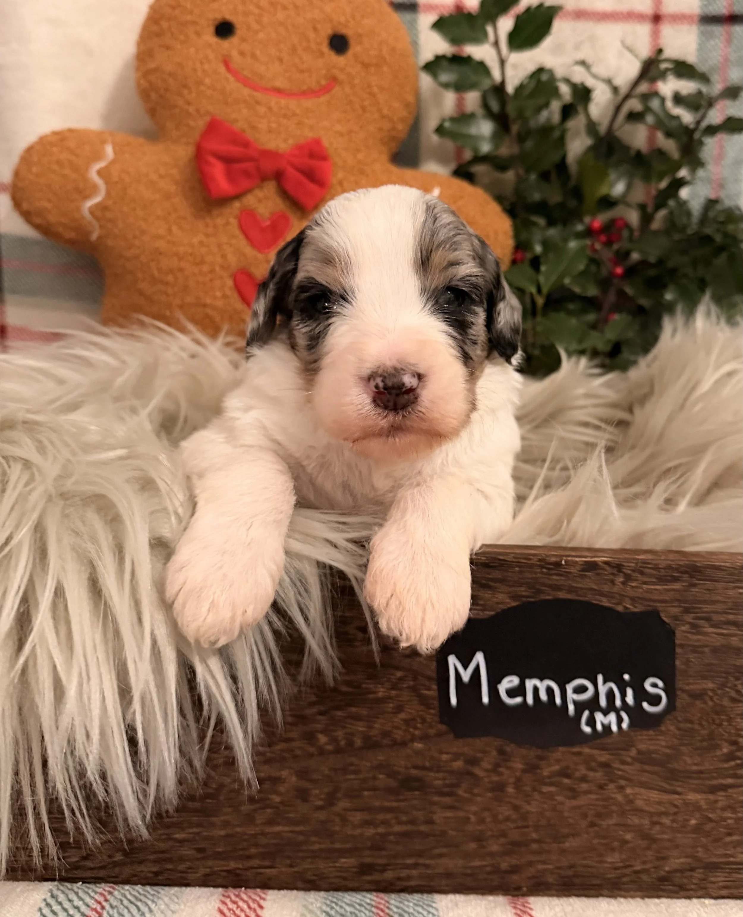 AVAILABLE Maggie’s Australian Saint Bernedoodles MEMPHIS (M) estimated size at maturity 55-65lbs go home date 1/17/26. Free delivery if within 4 hours of Keene NH