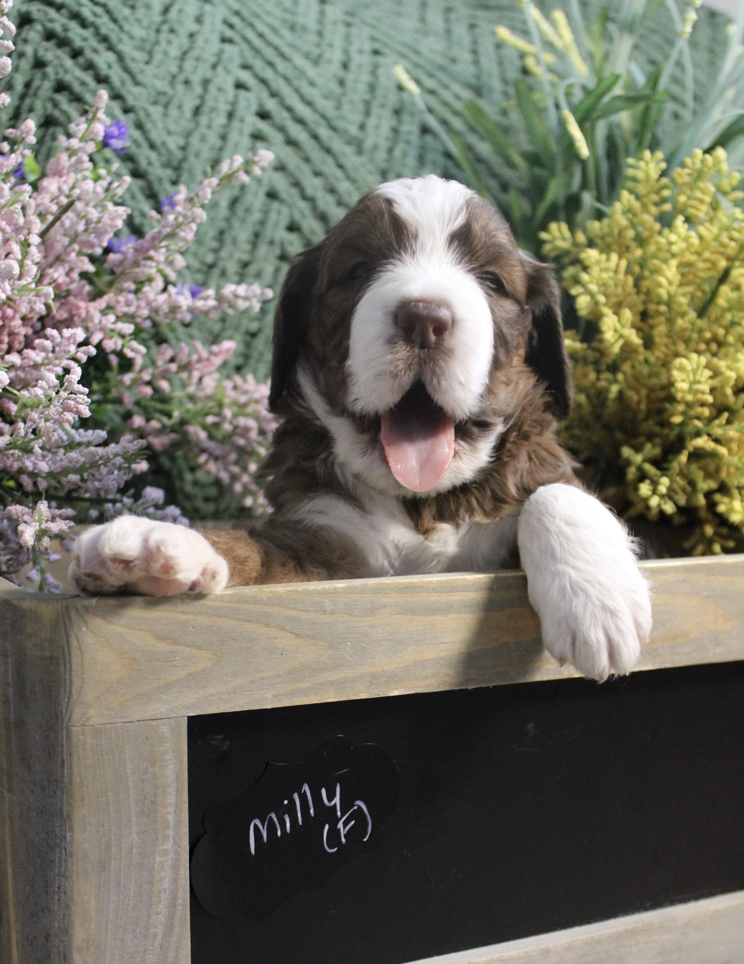 AVAILABLE River’s Australian Saint Bernedoodle MILLY (F) estimated size at maturity 55-65lbs go home date 2/19/26. Free delivery if within 4 hours of Keene NH