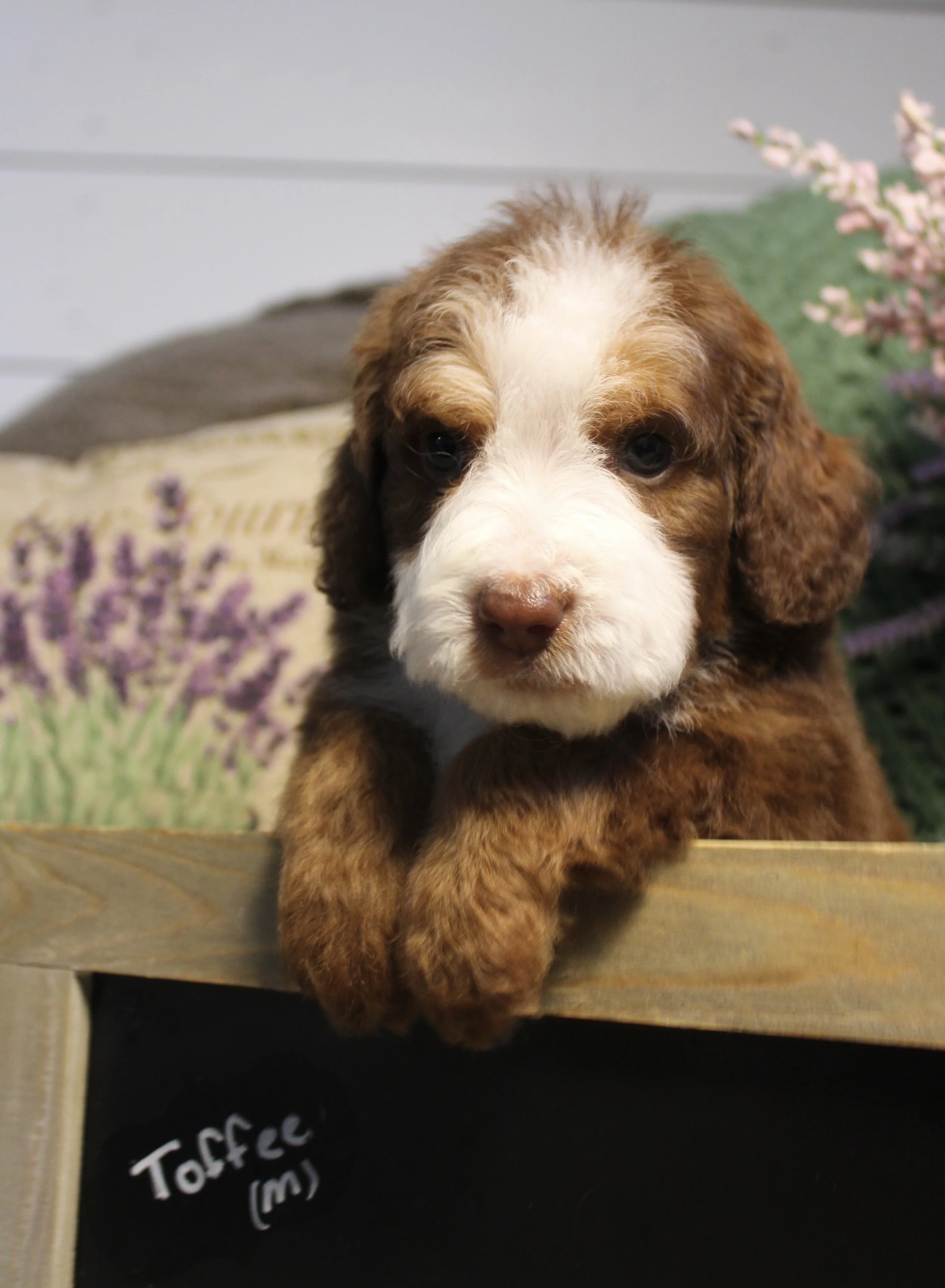 AVAILABLE Olive’s Australian Saint Bernedoodle TOFFEE (M) estimated size at maturity 55-65lbs go home date 2/8/26. Free delivery if within 4 hours of Keene NH