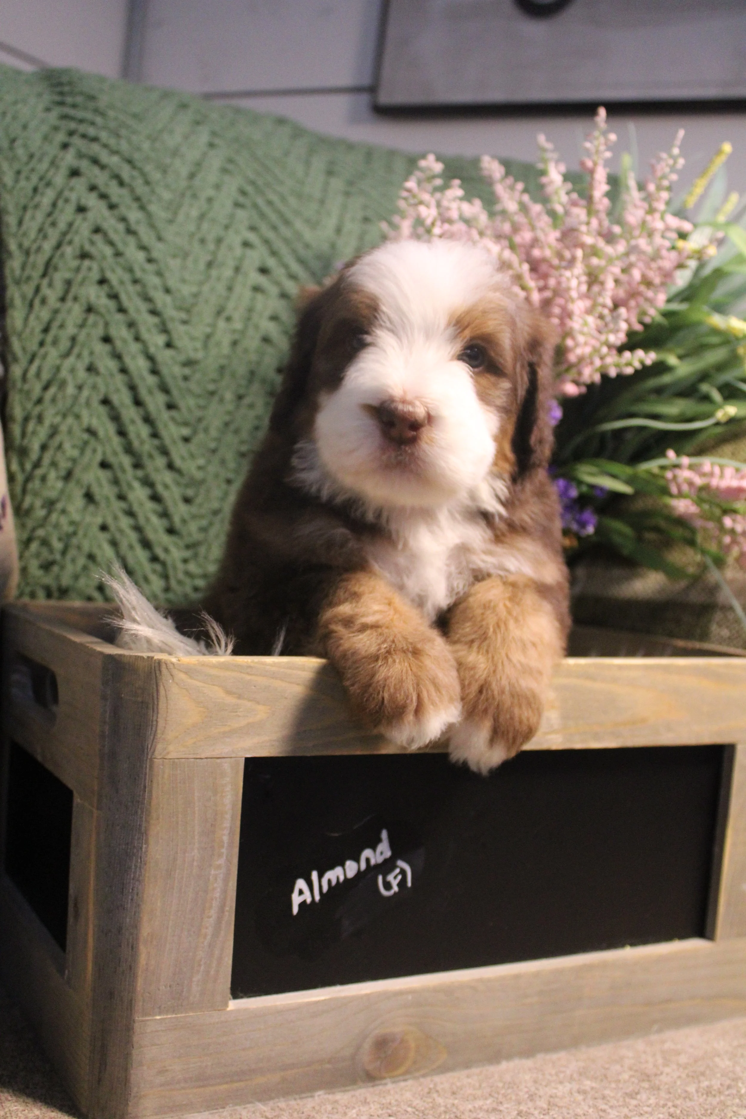 AVAILABLE Olive’s Australian Saint Bernedoodle ALMOND (F) estimated size at maturity 55-65lbs go home date 2/8/26. Free delivery if within 4 hours of Keene NH