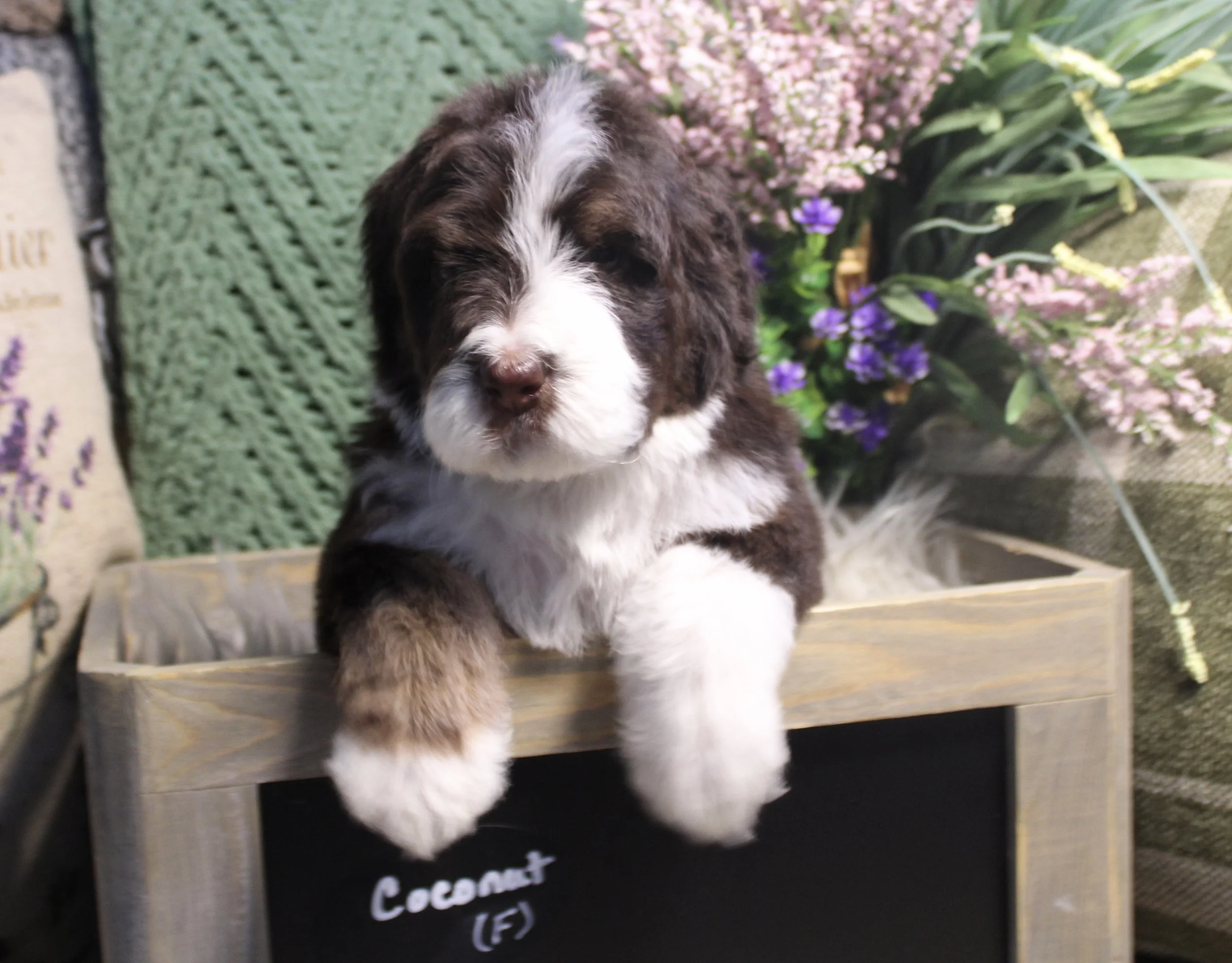 AVAILABLE Olive’s Australian Saint Bernedoodle COCOUNT (F) estimated size at maturity 55-65lbs go home date 2/8/26. Free delivery if within 4 hours of Keene NH