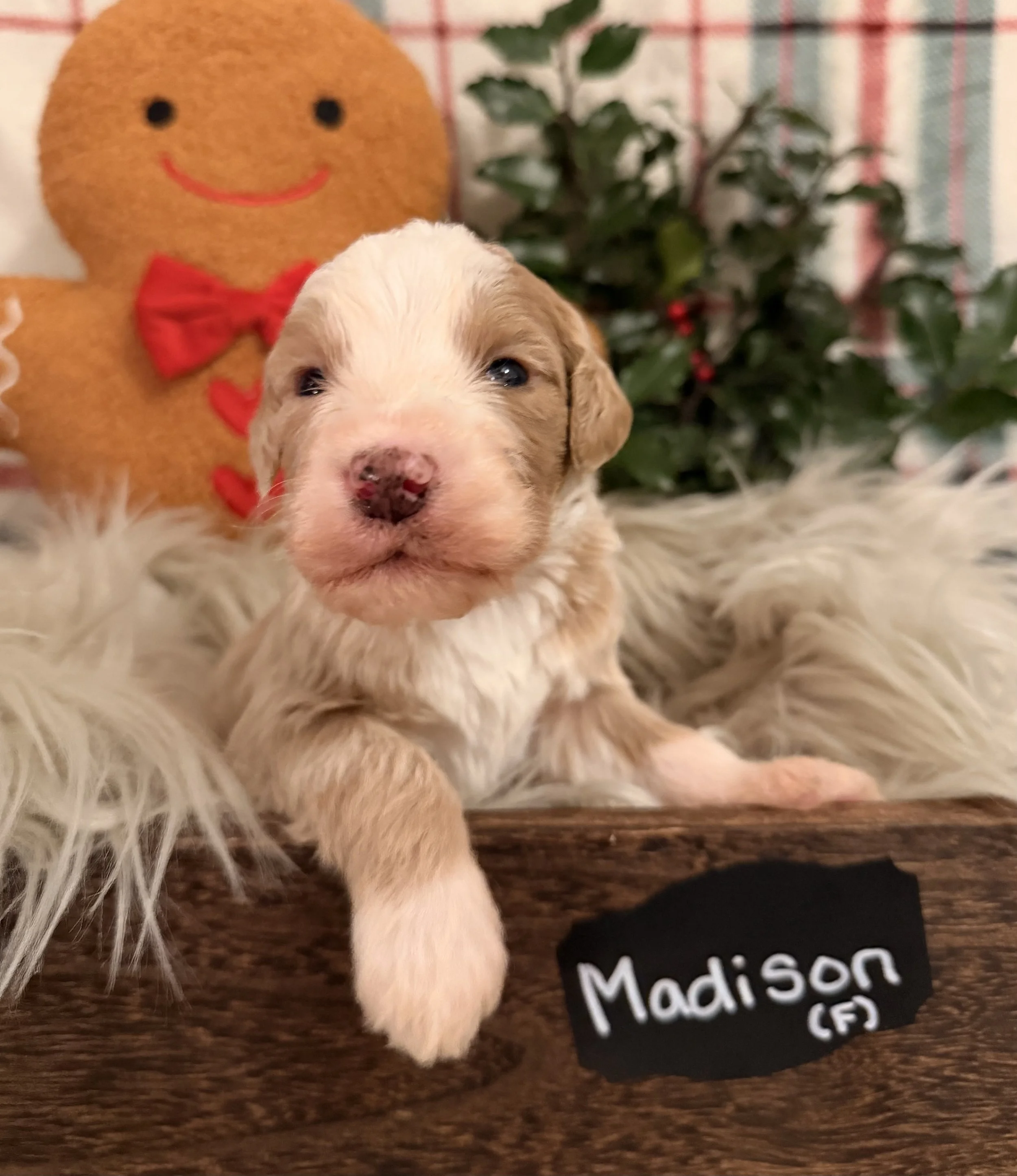 AVAILABLE Maggie’s Australian Saint Bernedoodles MADISON (F) estimated size at maturity 55-65lbs go home date 1/17/26. Free delivery if within 4 hours of Keene NH